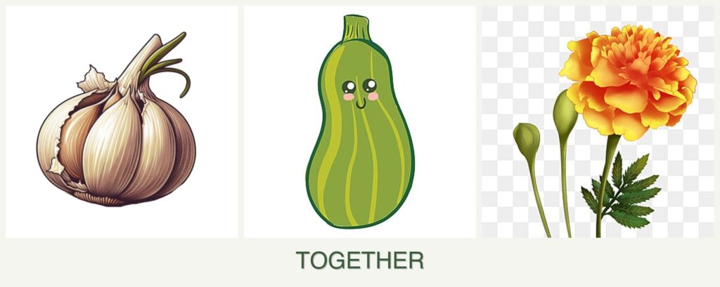 Planting garlic, zucchini, and marigolds together offers several benefits: