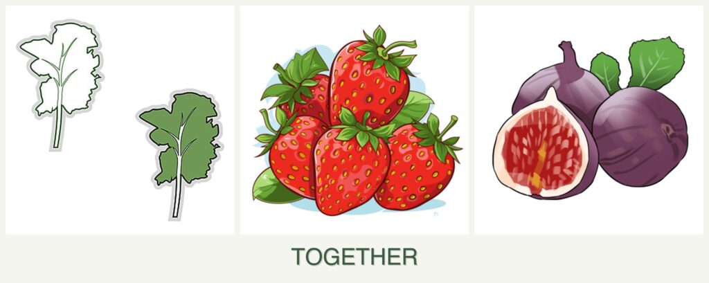 - Strawberries prefer full sun and can serve as a ground cover, reducing weeds around taller plants like figs.