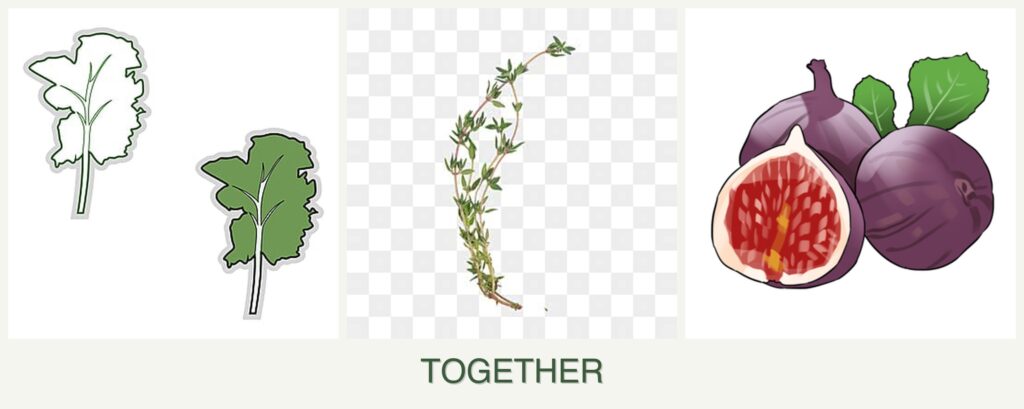 - Growth Requirements: Kale and thyme both prefer full sun and well-drained soil, making them suitable companions. Figs also require full sun but need more space due to their larger size.