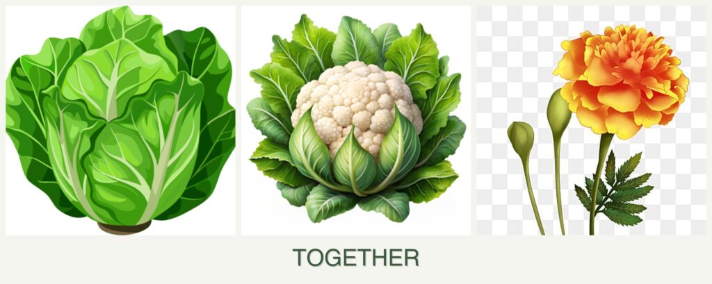 - Timing: Plant lettuce and cauliflower in early spring or late summer; marigolds are more flexible.