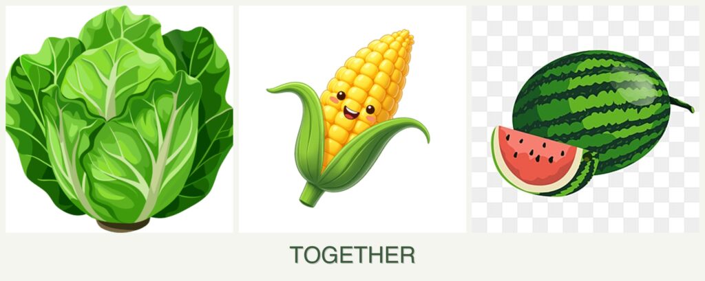 - Different Watering Needs: Melons require more water than lettuce and corn, so drip irrigation or careful watering schedules are recommended.