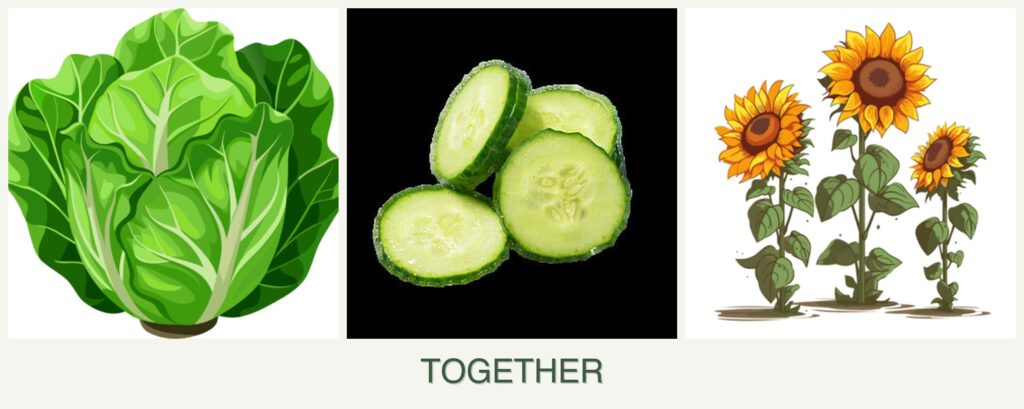 Pest Control: Sunflowers attract pollinators and beneficial insects, which can help control pests naturally. Cucumbers and lettuce are susceptible to aphids and slugs, and the presence of sunflowers can help reduce these threats.