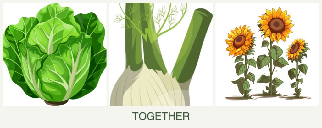 Growth Requirements: Lettuce thrives in cooler weather and partial shade, while sunflowers require full sun. Fennel also prefers full sun but can tolerate some shade. Sunflowers can provide partial shade for lettuce, extending its growing season.