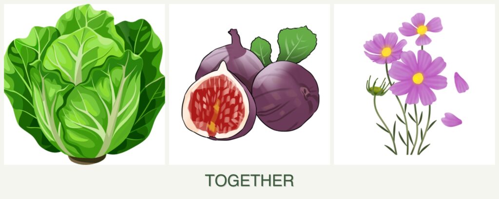 - Growth Requirements: Lettuce prefers cooler conditions, figs need full sun but can shade lettuce, and cosmos thrives in sunny spots.