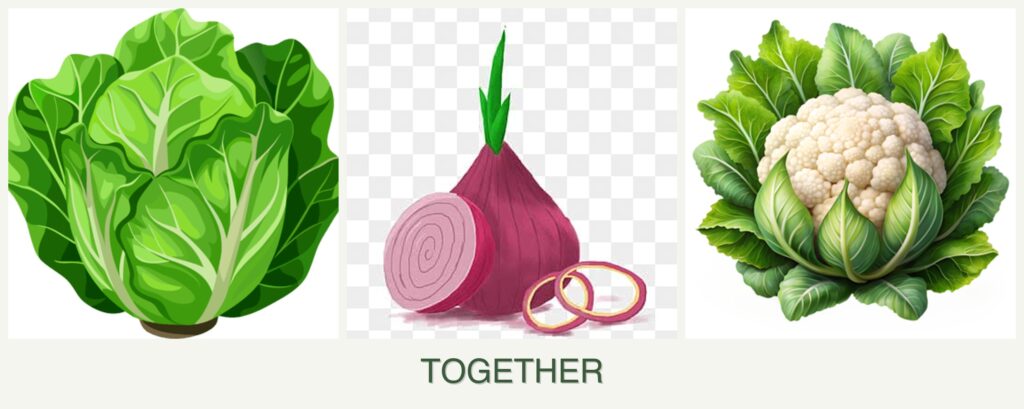 - Pest Control: Onions repel aphids and cabbage worms, common pests to lettuce and cauliflower.