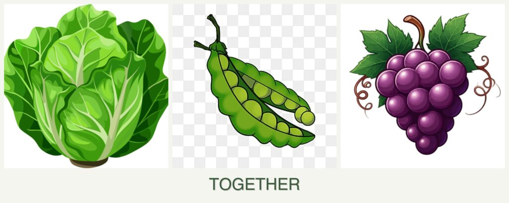 Growth Requirements: Lettuce thrives in cooler temperatures and partial shade, which can be provided by taller plants like peas and grapes. Peas, being nitrogen-fixers, enrich the soil, benefiting the nutrient needs of lettuce and grapes. Grapes, with their climbing nature, don’t compete for ground space, allowing lettuce and peas to grow below.