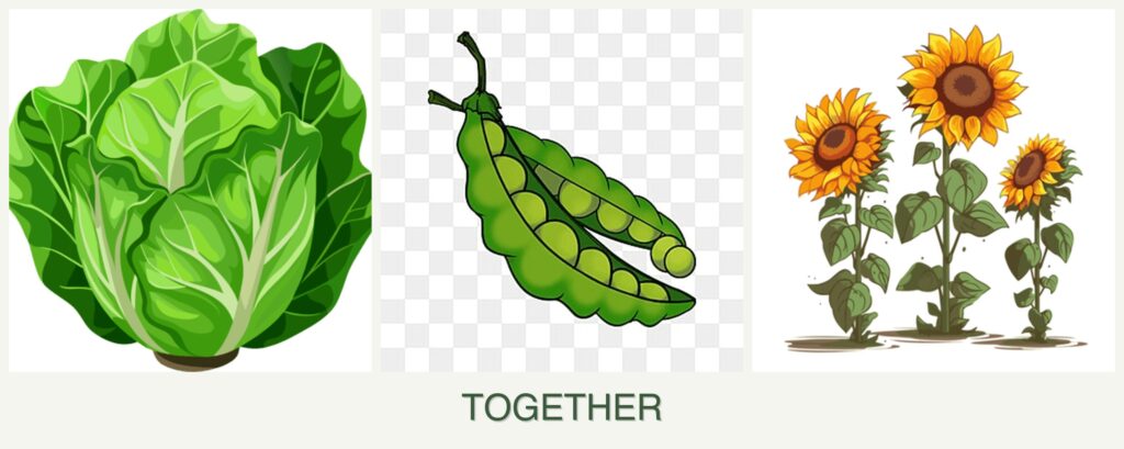- Growth Requirements: Lettuce prefers cooler temperatures and partial shade, which can be provided by the taller sunflowers. Peas also enjoy cooler weather and can climb up sunflower stalks, saving space.