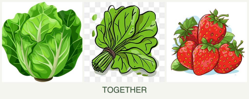 - Growth Habit: Lettuce and spinach grow low, while strawberries spread via runners.