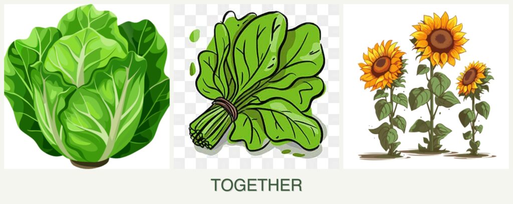 Nutrient Needs: Lettuce and spinach have similar nutrient requirements, while sunflowers can help draw nutrients from deeper soil layers, reducing competition.