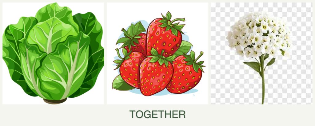 - Growth Requirements: Lettuce and strawberries thrive in similar conditions, preferring cool weather and well-drained soil. Alyssum is versatile and can adapt to these conditions as well.