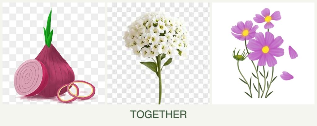 - Pest Control: Onions deter pests like aphids, which can benefit both alyssum and cosmos.