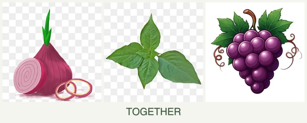 - Pest Control: Onions act as natural pest repellents, which can benefit basil but are less effective for grape-specific pests.