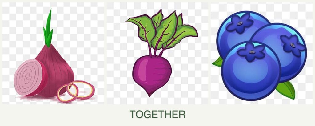 - Growth Requirements: Onions and beets share similar growth conditions, needing full sun and well-drained soil, whereas blueberries require acidic soil and can tolerate partial shade.
