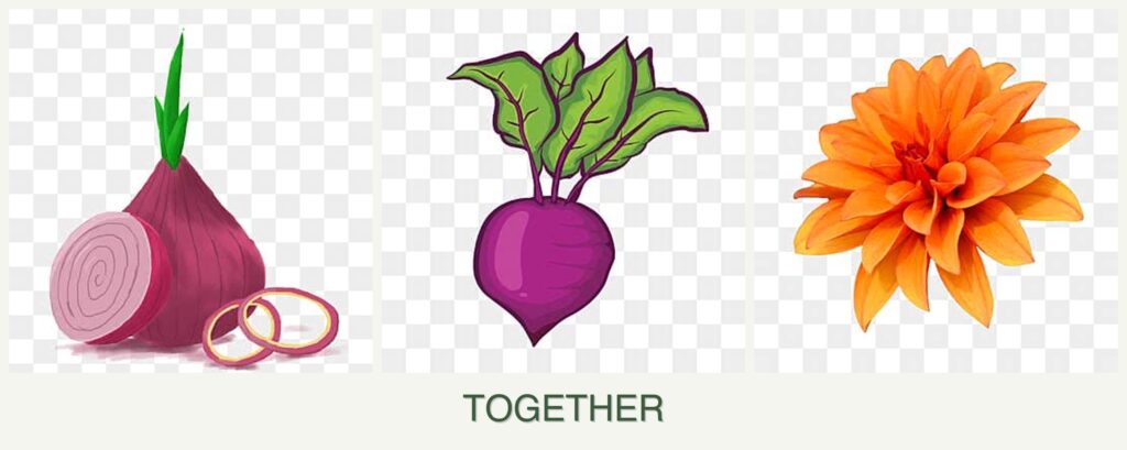 - Growth Requirements: Onions and beets thrive in similar conditions—full sun, well-drained soil, and moderate water. Dahlias also prefer full sun and well-drained soil, making them compatible in terms of basic needs.