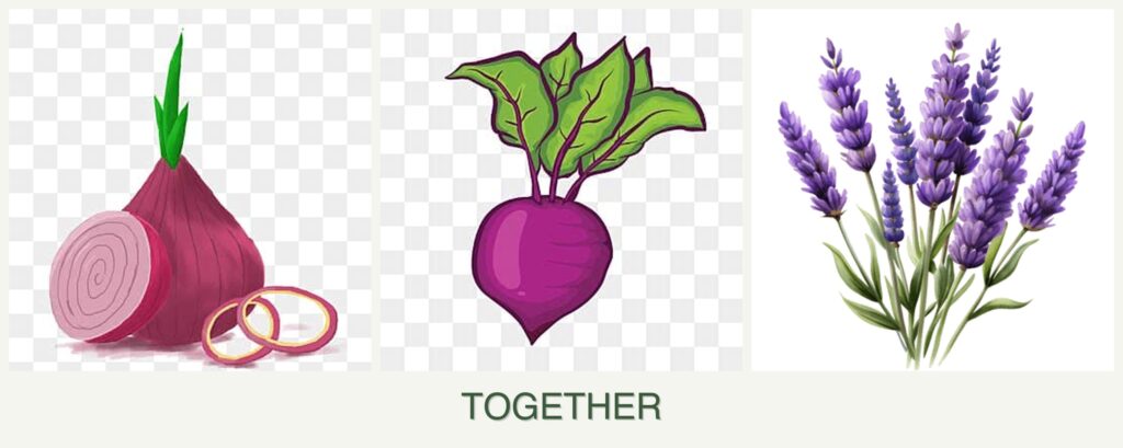Growth Requirements: Onions and beets thrive in similar soil conditions and have compatible watering needs, making them good companions. Lavender, while slightly different in its needs, can still coexist with these vegetables if space and conditions are managed well.