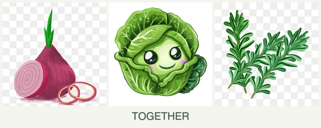 - Growth Requirements: Onions and cabbage share similar water and nutrient needs, while rosemary requires less water and well-drained soil.