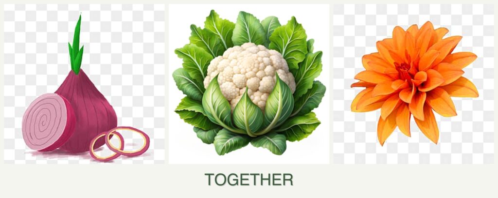 Growth Requirements: Onions prefer full sun and well-drained soil, while cauliflower also thrives in full sun but needs more consistent moisture. Dahlias require full sun and rich, well-drained soil. Ensuring each plant’s needs are met is crucial for successful companion planting.