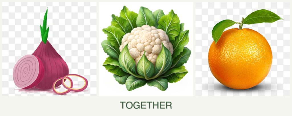 Growth Requirements: Onions and cauliflower share some climate compatibility, but their spacing needs differ. Oranges require a completely different environment, including more sunlight and warmer temperatures.