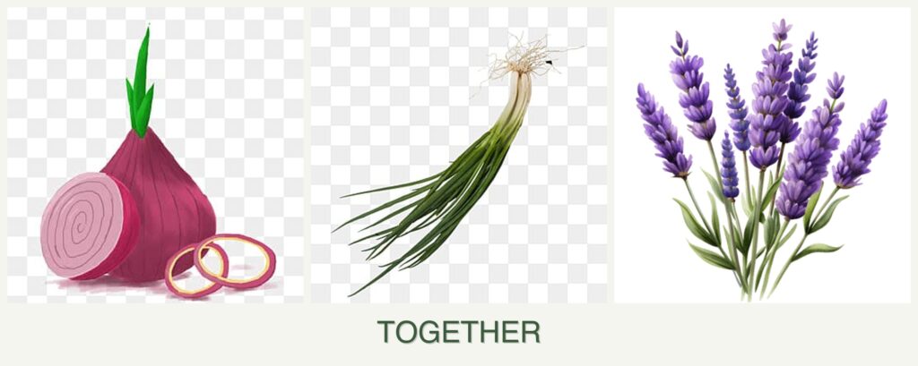 - Pest Control: Lavender’s strong scent repels pests that might target onions and chives.