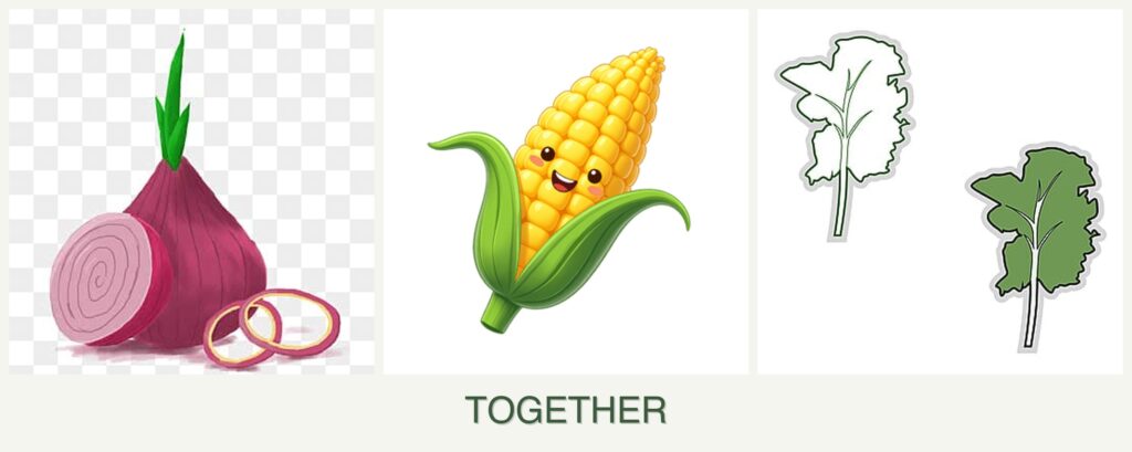 - Competition for Resources: Corn’s high water needs can stress onions and kale.