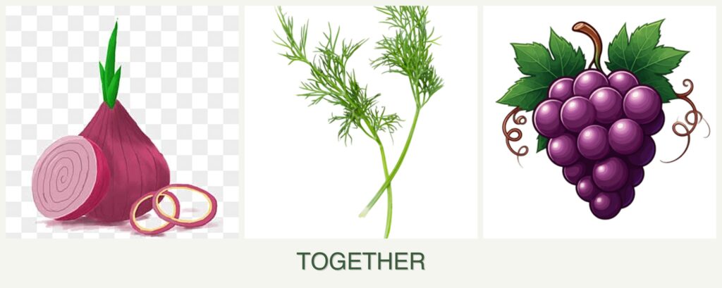 - Watering Needs: Grapes require consistent watering, which may differ from onions and dill.