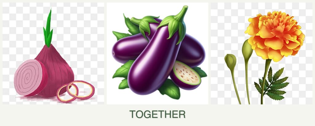 - Pest Control: Marigolds are known for their ability to repel nematodes and other garden pests, which can protect both onions and eggplants from potential infestations.