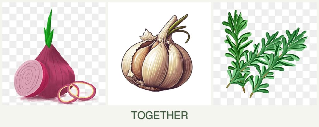 - Soil Health Benefits: Onions and garlic can help improve soil structure, while rosemary’s deep roots can bring nutrients up from lower soil layers.