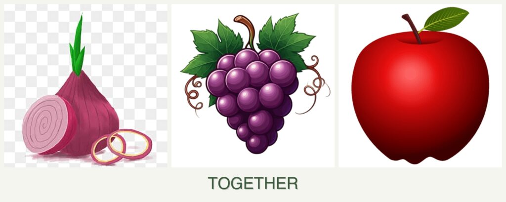 - Growth Requirements: Onions thrive in full sun with well-draining soil, while grapes and apples also prefer sunny locations but require more space for their sprawling and tall growth habits.