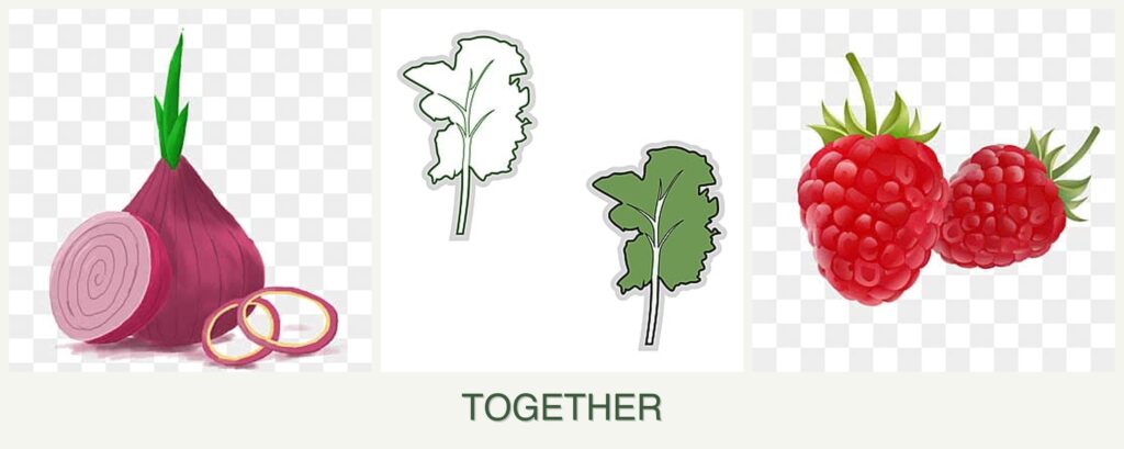 - Onions should be 4-6 inches apart, while raspberries need 2-3 feet. Ensure raspberries don’t overshadow onions.
