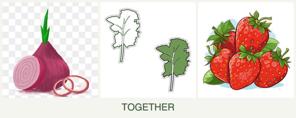 - Strawberries thrive in the presence of onions, as they can deter pests and improve strawberry health.