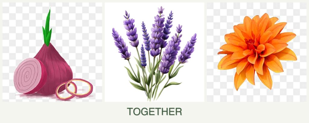 - Growth Requirements: Onions prefer cool weather, lavender thrives in sunny, dry conditions, and dahlias need rich, moist soil.