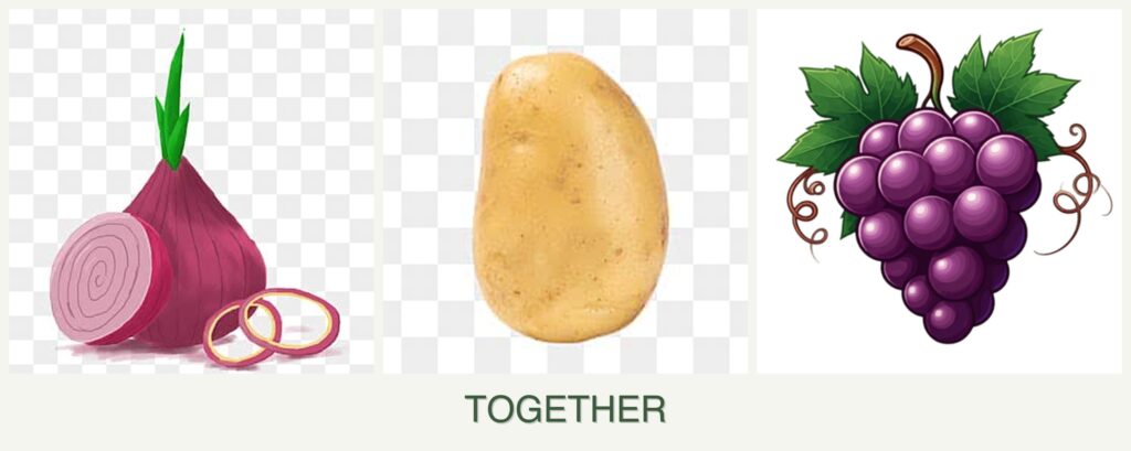 - Growth Requirements: Onions and potatoes thrive in similar soil conditions but differ significantly from grapes, which require more space and a trellis for support.