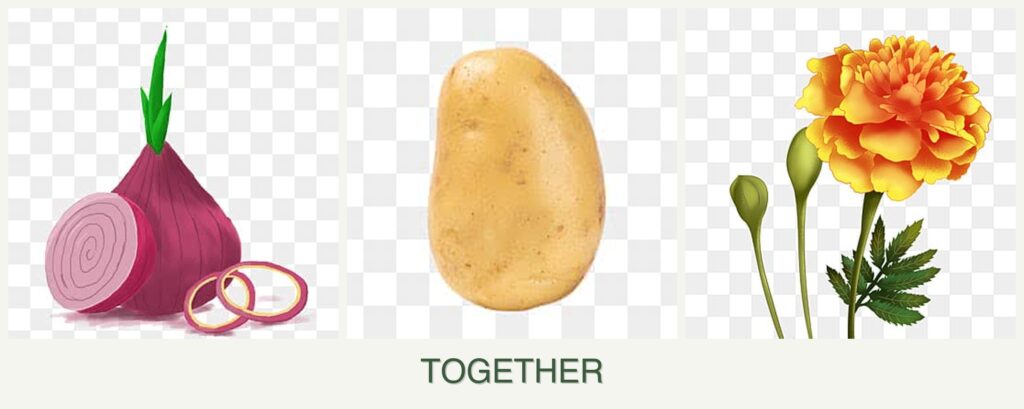 - Growth Requirements: Onions and marigolds prefer full sun, while potatoes can tolerate partial shade.