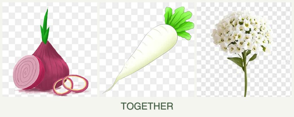 - Pest Control: Onions emit a strong scent that deters pests such as aphids, which can be beneficial for radishes. Alyssum attracts beneficial insects that prey on pests, providing a natural pest control solution.