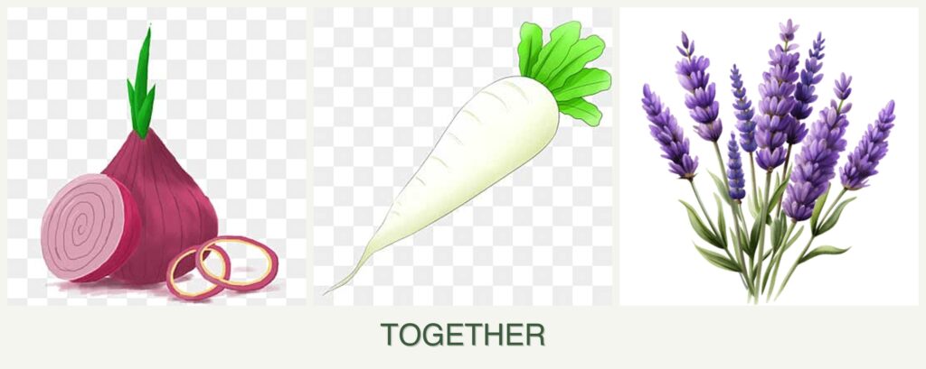 - Pest Control: Onions are known to repel pests like aphids and carrot flies, which can benefit both radishes and lavender. Lavender’s aromatic properties can deter moths and other insects, providing additional protection.
