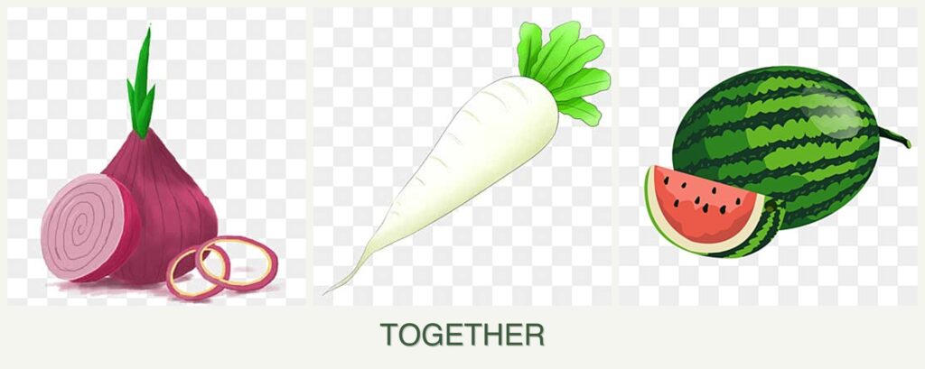 Growth Requirements: Onions and radishes have similar needs, thriving in cooler weather with moderate water and well-drained soil. Melons, however, prefer warm conditions and require more space and sunlight.