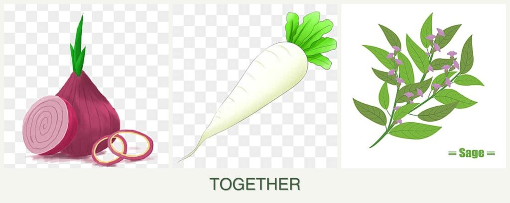 - Pest Control: Onions and sage can help repel pests that commonly affect radishes, reducing the need for chemical interventions.
