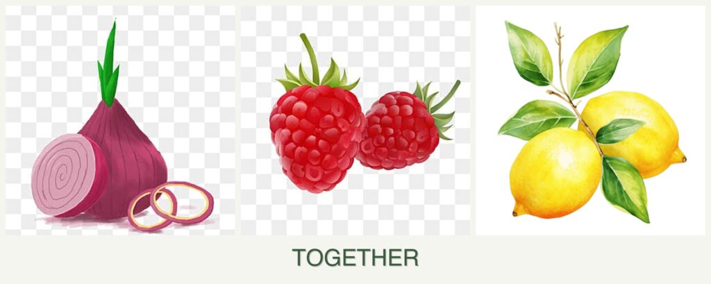 Onions are known for their pest-repellent properties, while raspberries and lemons attract different pollinators. However, they compete for soil nutrients, and their varying water needs complicate shared planting.