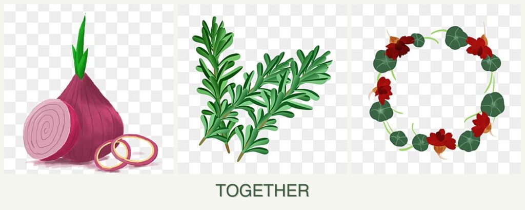 - Pest Control: Onions act as a natural pest deterrent, warding off insects like aphids. Rosemary’s strong scent also helps repel pests. Nasturtiums can attract beneficial insects and trap pests like aphids, keeping them away from other plants.