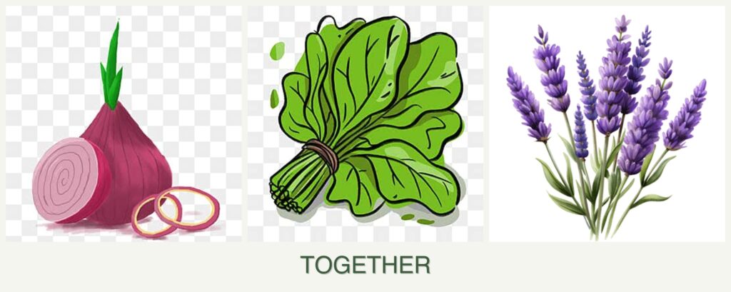 - Growth Requirements: Onions and spinach prefer similar soil conditions, while lavender thrives in drier, well-drained soil.