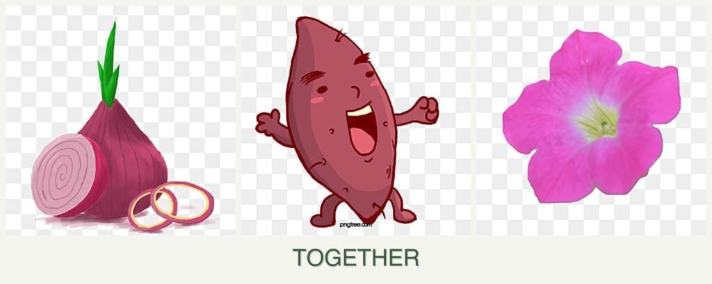 - When is the best time to plant them together? Plant onions in early spring, sweet potatoes after the last frost, and petunias when the soil warms.