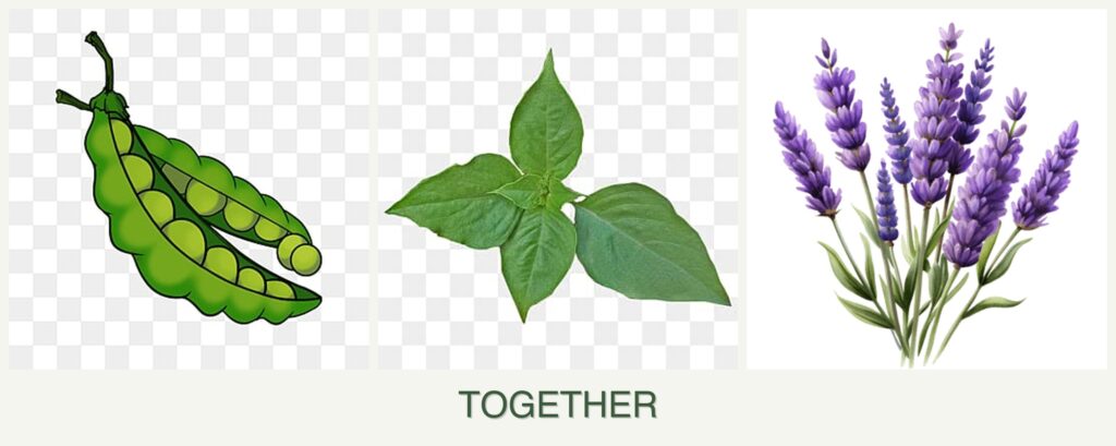 - Soil Health Benefits: Peas fix nitrogen, benefiting basil and lavender by enriching the soil.