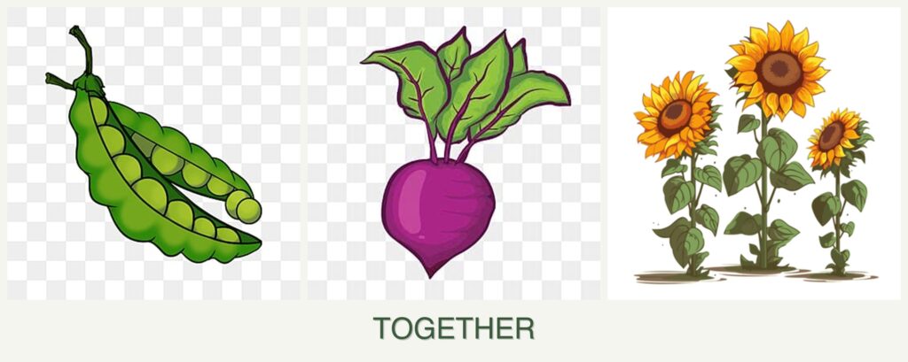 - Growth Requirements: Peas are climbing plants that need support, while beets are root vegetables that grow underground. Sunflowers are tall and can provide natural support for peas.