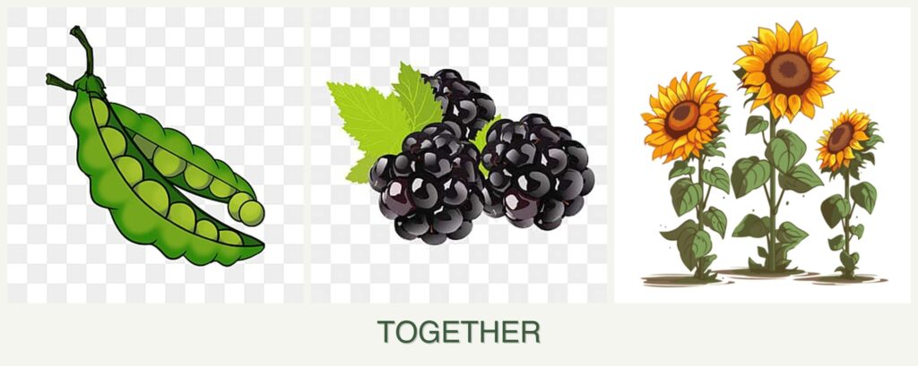 - Nutrient Needs: Peas, being legumes, fix nitrogen in the soil, which can benefit blackberries and sunflowers. However, blackberries and sunflowers are heavy feeders, so soil fertility must be managed.
