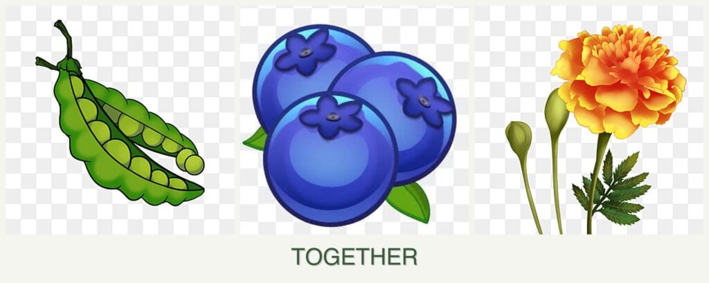 Nutrient Needs and Spacing: Peas fix nitrogen, which can benefit marigolds but not blueberries, which prefer acidic conditions. Each plant has different spacing needs, making it challenging to grow them together.