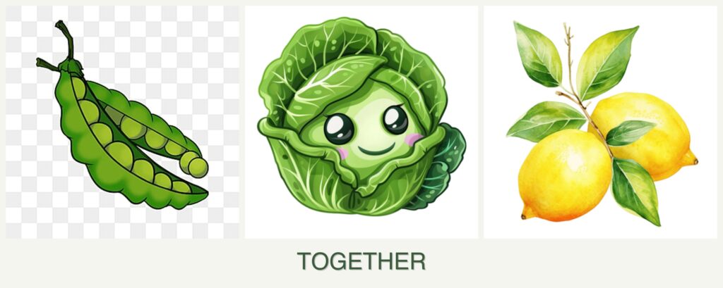 - Growth Requirements: Peas and cabbage prefer cooler climates and can grow well in similar soil types, while lemons need warm, sunny conditions.