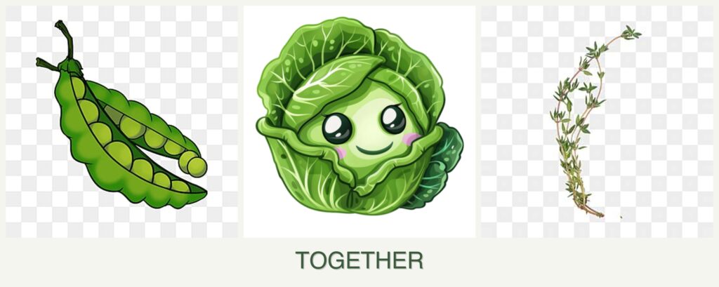 - Growth Requirements: Peas, cabbage, and thyme have overlapping sunlight and soil needs, making them compatible companions.
