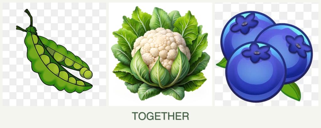 - Pest Control: Peas and cauliflower can benefit from mutual pest deterrence, but blueberries do not share these pests.