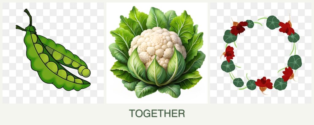 - Timing: Plant peas in early spring, followed by cauliflower, and add nasturtiums when the risk of frost has passed.