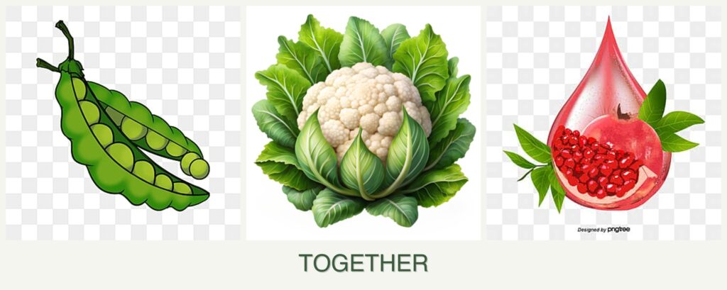 - Growth Requirements: Peas and cauliflower can coexist in cooler climates, but pomegranates need warmth.